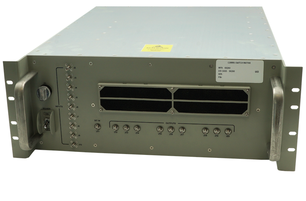 The iRFA-7703 RF Signal Switch Matrix is a non-blocking switch matrix with 9 outputs, 9 inputs and a BIT test input that executes a strobe driven switch configuration table through remote control.